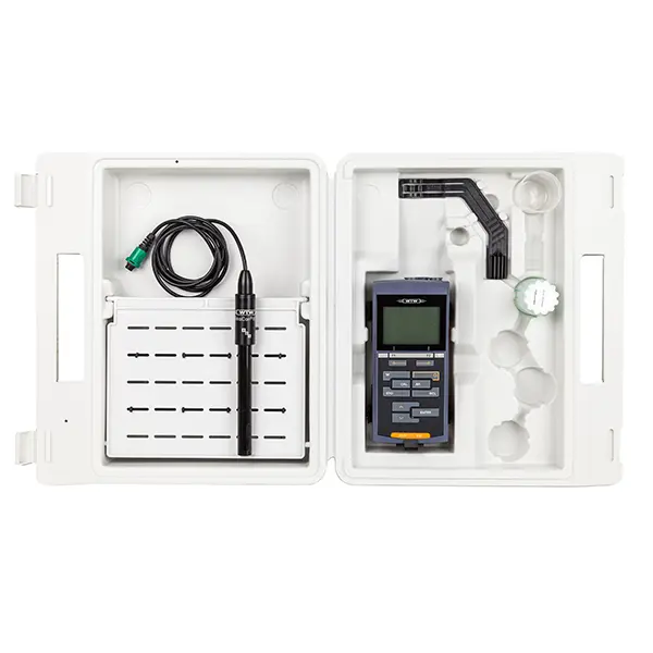 Einzelgerät im Tragekoffer mit Puffer 4 und 7, 0,01 mol/l KCl Leitfähigkeitsstandard, Bedienungsanleitung, Stativ, Becher, CD-ROM, Treibersoftware für USB, Batterien, Kabel, Armierung SM Pro